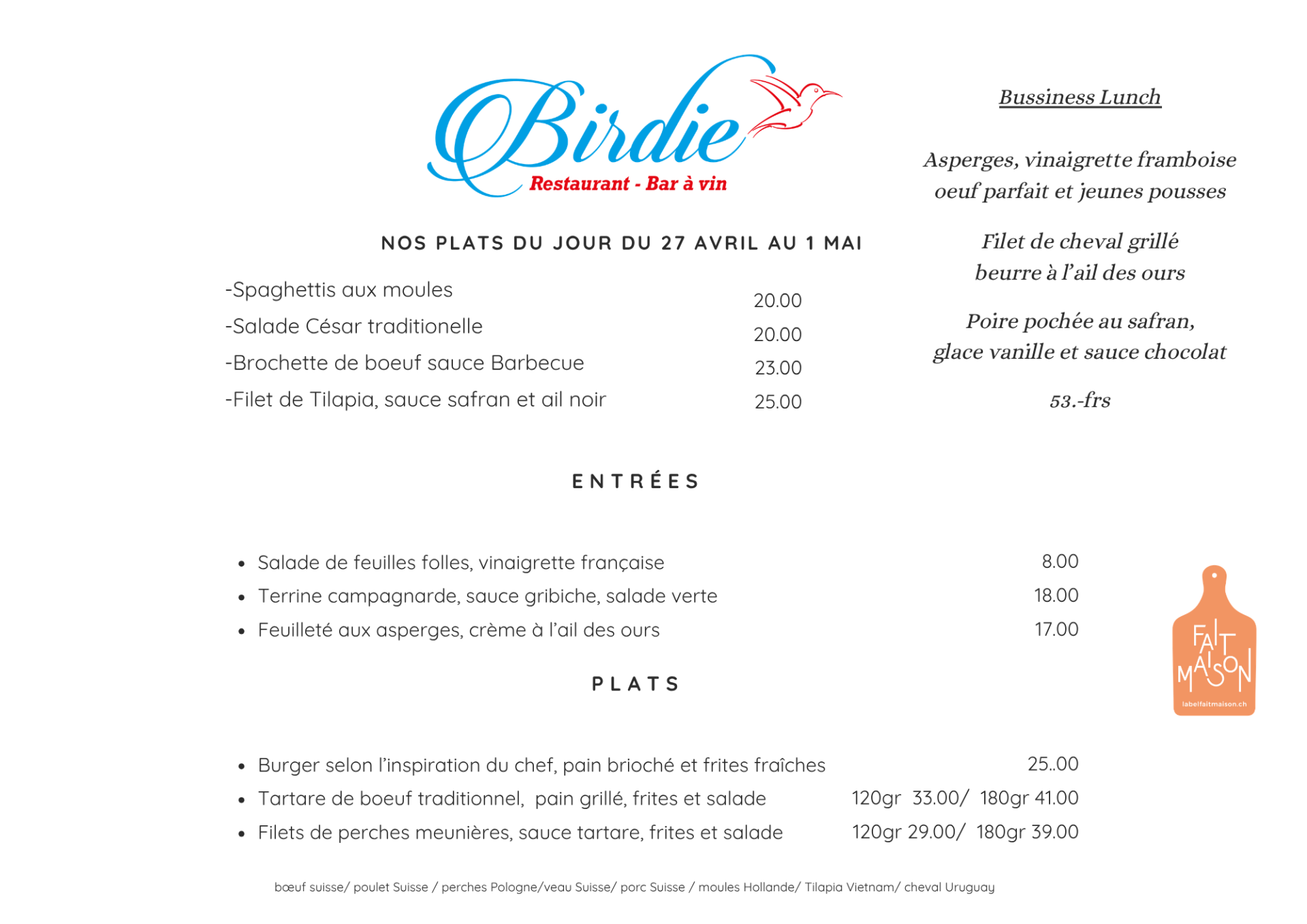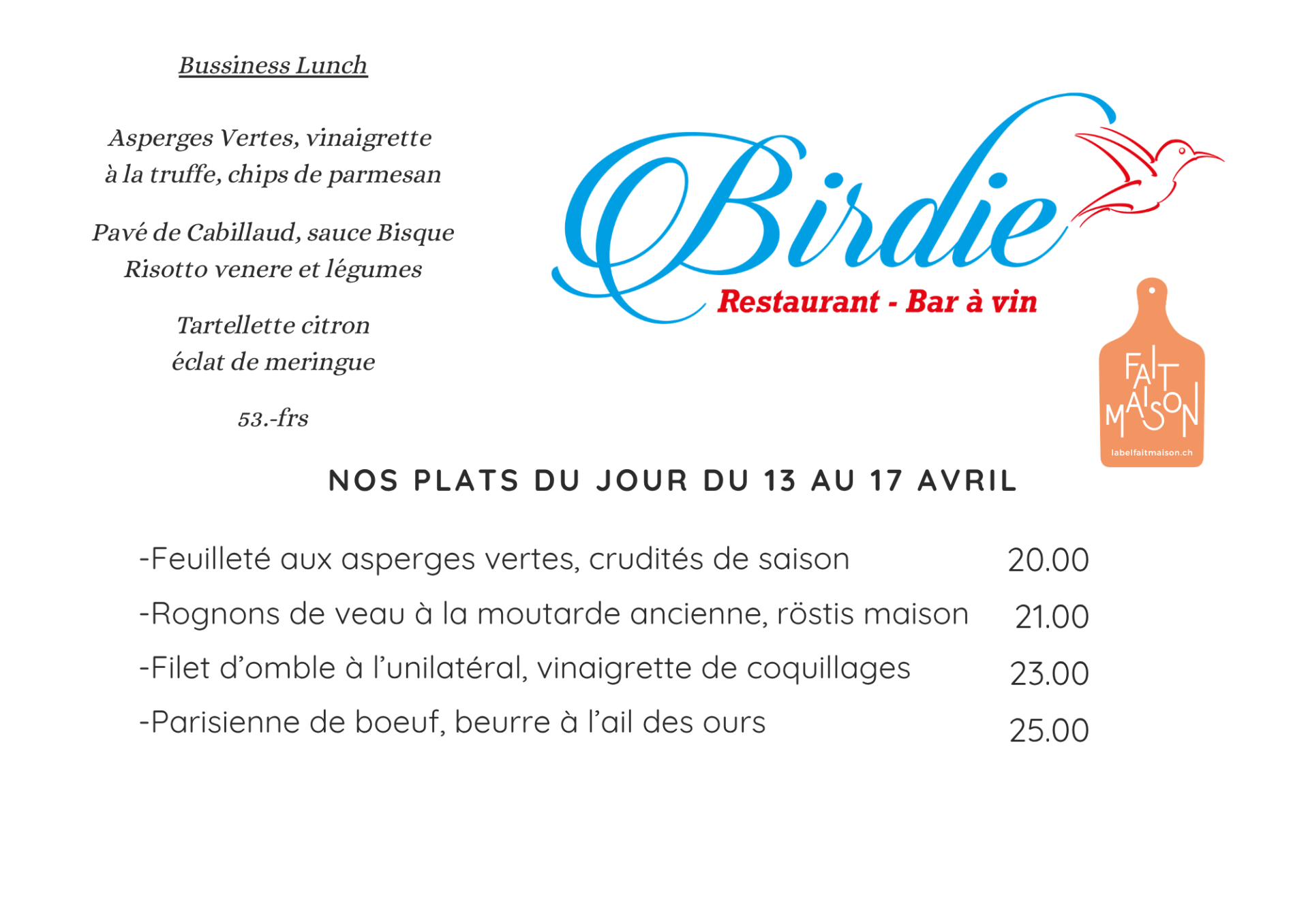 Nous vous proposons 4 plats du jour à choix tous les midis du lundi au vendredi